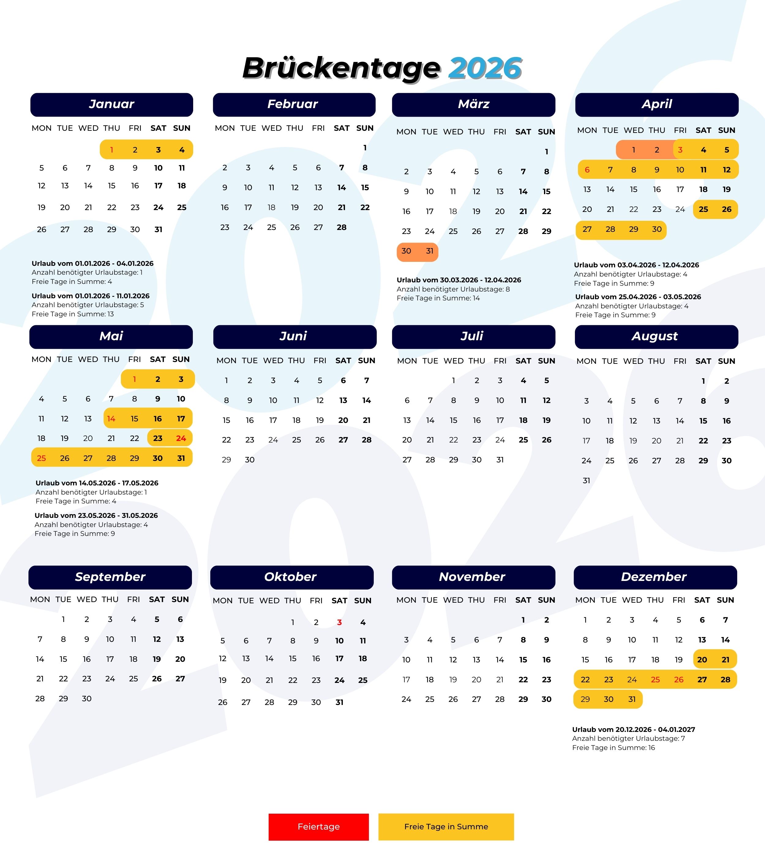 Brückentage 2026 in der Kalender Übersicht. Alle möglichen freien Tage in Summe auf einen Blick für Eure Urlaubsplanung 2026.