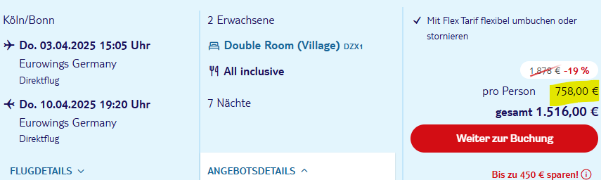 Geflogen wird zum günstigsten Termin inkl. Gepäck mit Eurowings ab Köln-Bonn. Termine gibt es von Dezember 2024 – April 2025.
