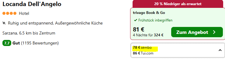Ihr wolltet schon immer mal nach Cinque Terre? Dann schaut Euch dieses Schnäppchen an. Wir haben einen tollen Deal für Euch zusammengestellt. Zum günstigen Preis von nur 196 € pro Person bekommt Ihr 5 Tage im 4* La Locanda dell'Angelo sowie den Hin- & Rückflug nach Italien. Möglich ist dies durch eine getrennte Buchung von Hotel und Flug.